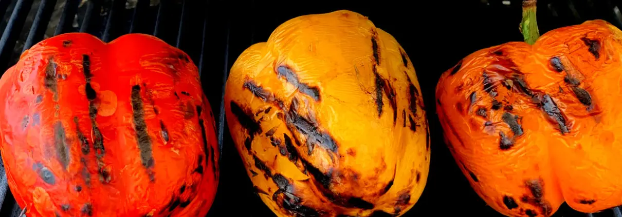 Wir haben den Gasgrill auf 250 Grad hochgeheizt, die Paprika auf den Rost gelegt und den Deckel dann wieder verschlossen. Da wir sehr neugierig sind, haben wir den Garfortschritt öfter kontrolliert und die Schoten gewendet. Insgesamt hat es ca. 25 Minuten gedauert bis die Paprikas den gewünschten Grad der Verbrennung erreicht hatten.